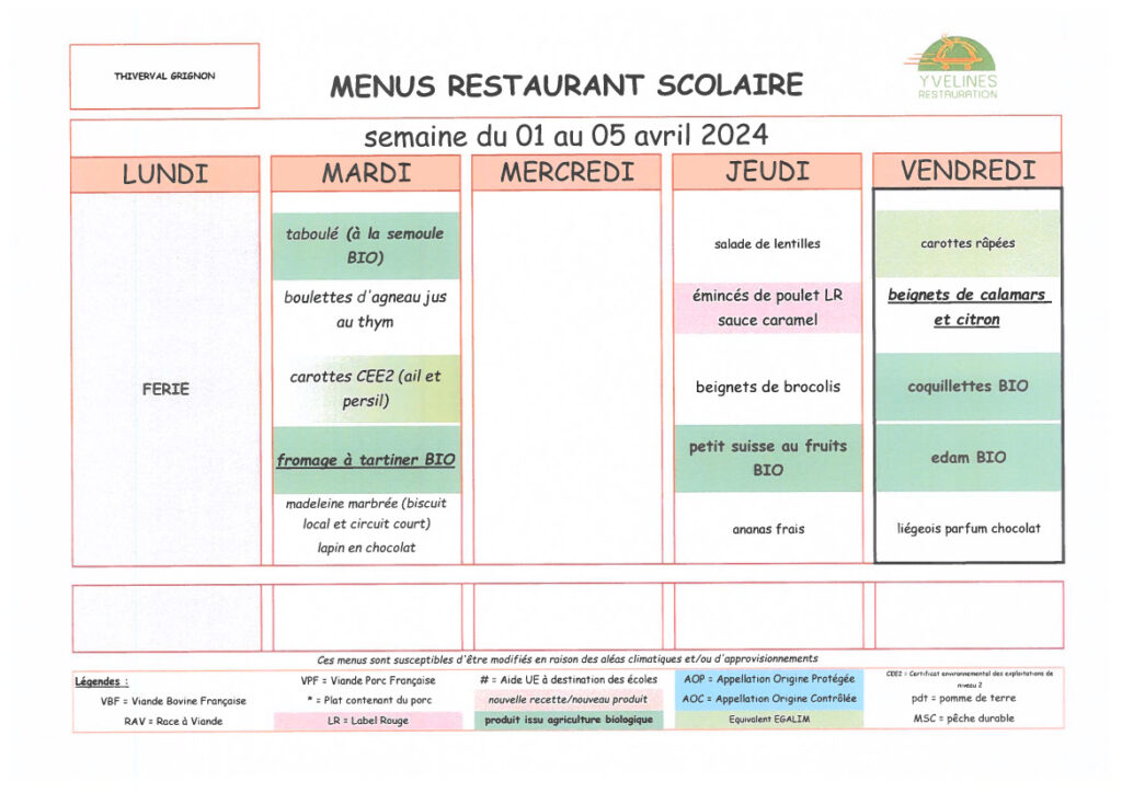 Menu des restaurants scolaires : Semaine du 01/04/2024