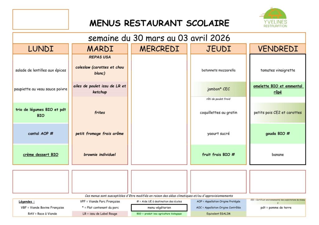 Menu des restaurants scolaires : Semaine du 30/03/2026