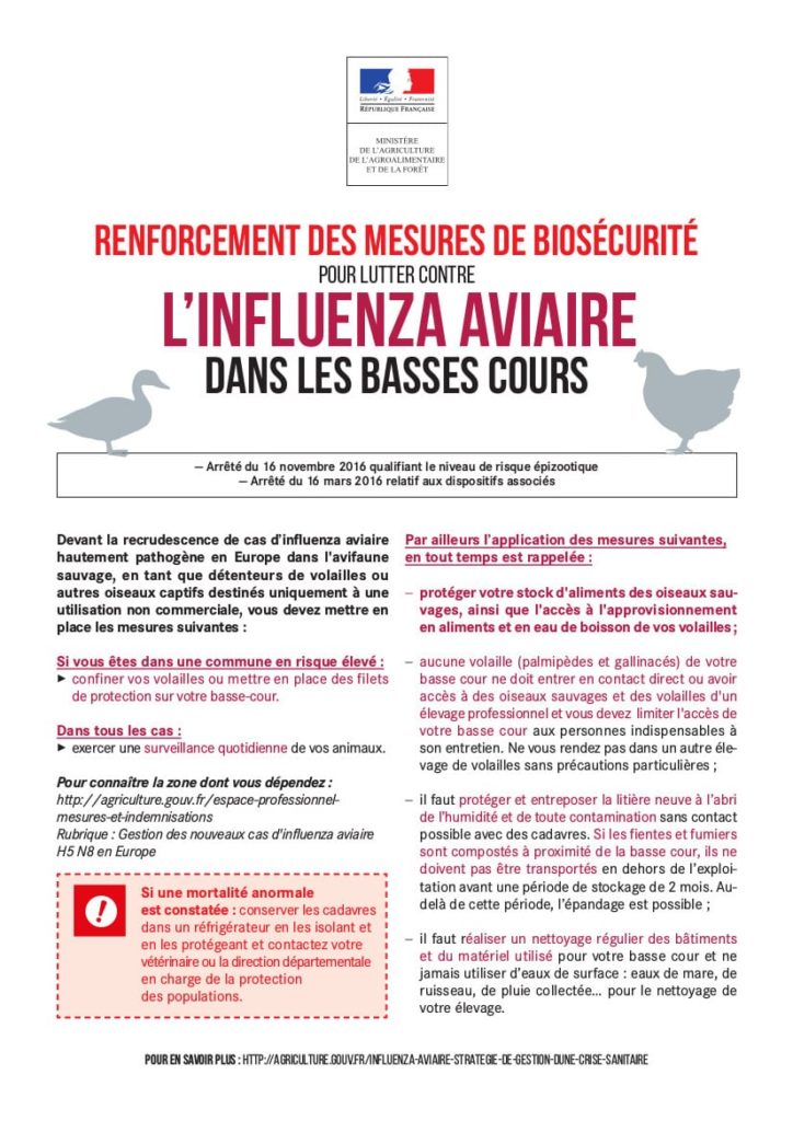 Devant la recrudescence de cas d’influenza aviaire hautement pathogène en Europe dans l’avifaune sauvage, en tant que détenteurs de volailles ou autres oiseaux captifs destinés uniquement à une utilisation non commerciale, vous devez mettre en place les mesures suivantes.
